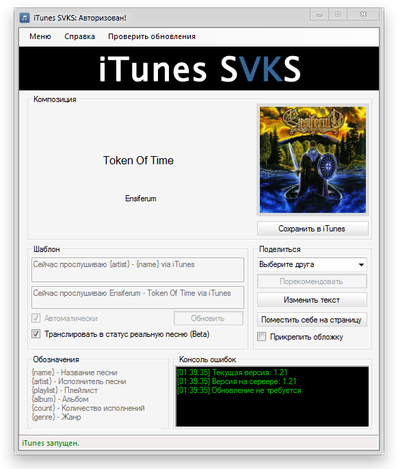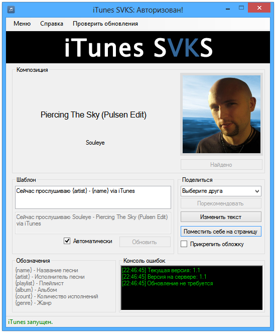 Вы активно пользуетесь сайтом ВКонтакте? Все песни Вы прослушиваете в плеере iTunes? Вы хотите, чтобы о том, какую Вы в данный момент слушаете песню знал весь мир? Тогда данная программа для Вас!