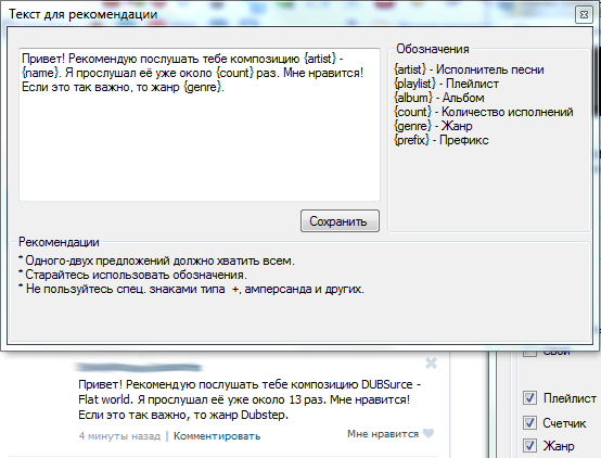 Так чего же вы ждёте? Просто введите в поле «Шаблон» желаемый статус, используя специальные обозначения. Поле снизу покажет Вам, как будет выглядеть Ваш статус.