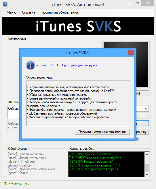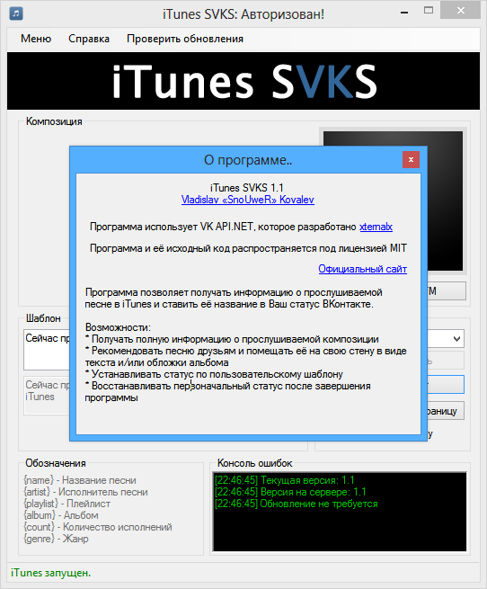 Программа позволяет получать информацию о прослушиваемой песне в iTunes и ставить её название в Ваш статус ВКонтакте.